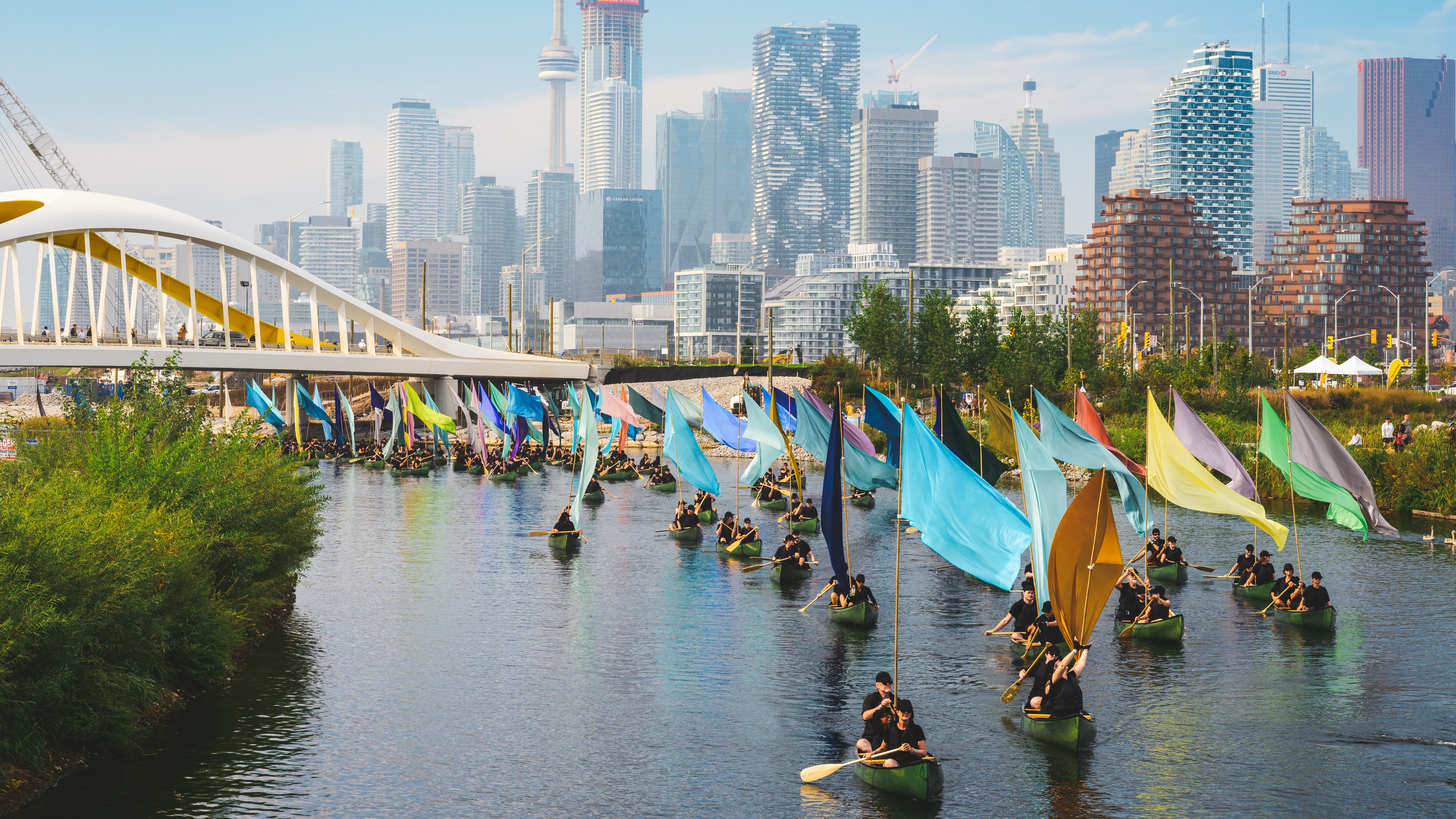 A Lake Story, a new commission by artist Melissa McGill and presented by The Bentway, brought together more than 400 local canoers and paddlers for a slow-moving, choreographed procession on September 27 and 28. Each canoe carried a large color field painting created with pigments sourced directly from the lake and its shoreline, designed to be “activated” by the wind. As the fleet stretched across the harbor, the lake’s natural palette was reflected across the sky and water, transforming the waterfront into a vibrant canvas.